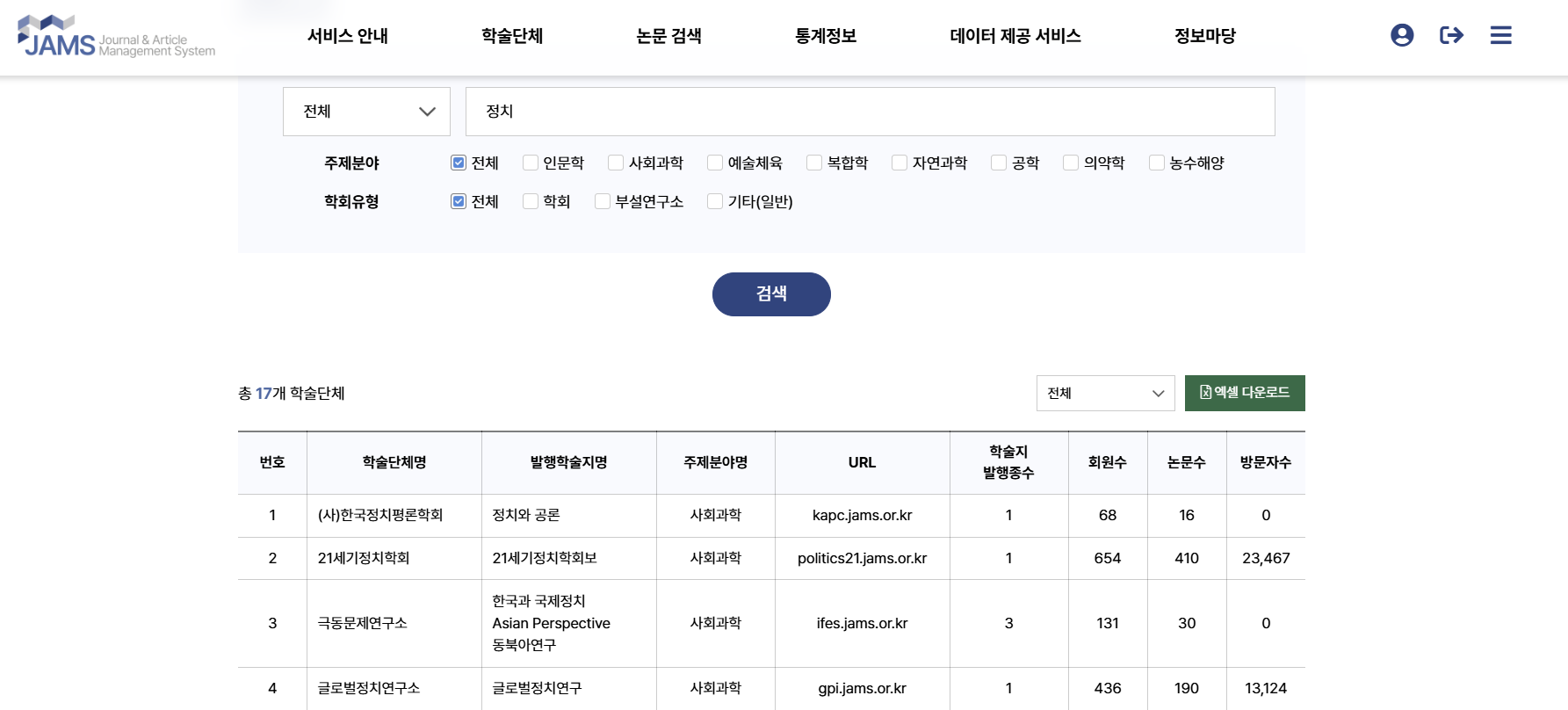 메뉴에서 '학술단체'를 들어가서 관심있는 주제분야를 검색하면(ex. 정치, 통계, 빅데이터, 기계 등) 관련 학회-학술지-URL을 리스트업해준다.