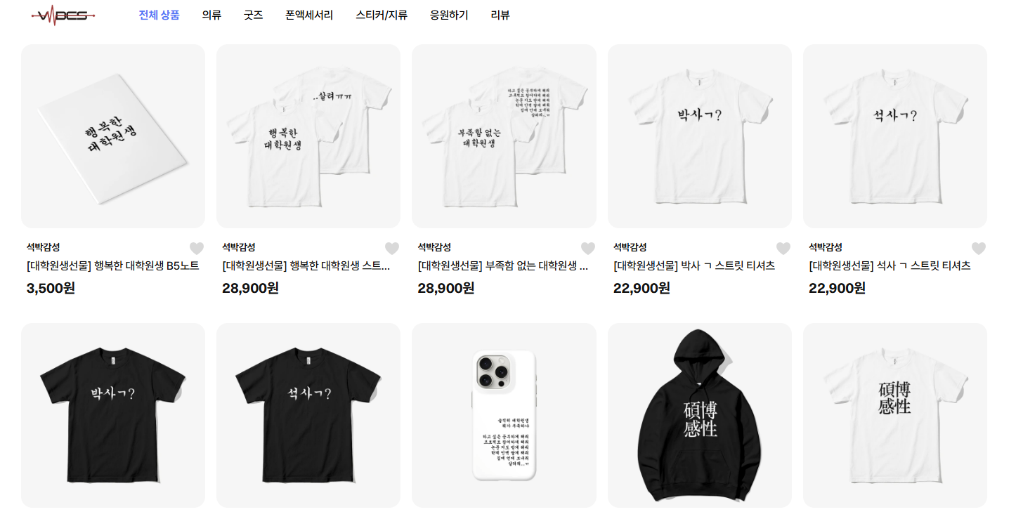 티셔츠(반팔, 후드티), 휴대폰 케이스, 노트 등 다양한 문구류를 판매하고 있다.
