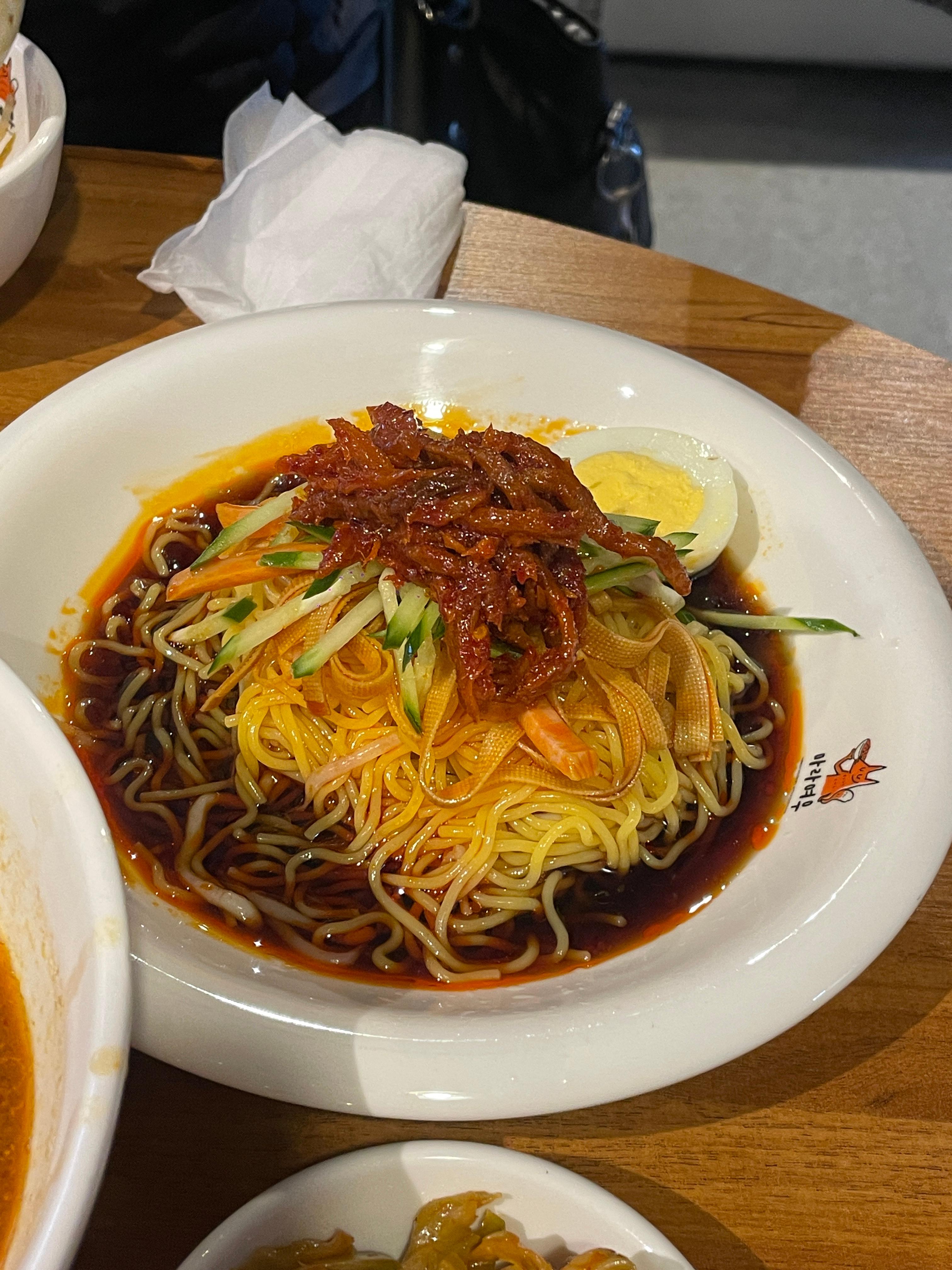 차갑고 얇은 소면이 소스랑 잘 어울려서 식감은 꽤 만족스러웠다.